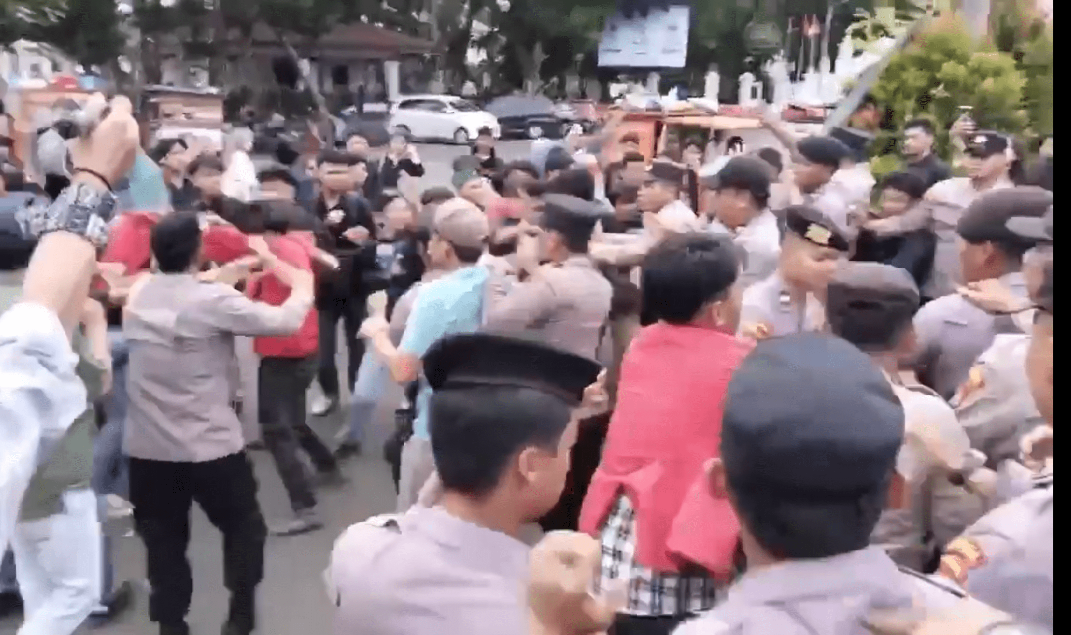 Aksi saling dorong antara mahasiswa dan Polisi pun tak terhindarkan, polisi terus berupaya menghalau mahasiswa yang memaksa menerobos masuk ke dalam Kantor Bupati Serang untuk menyampaikan aspirasinya.